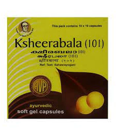 Arya Vaidya Pharmacy (AVP) Ksheerabala 101 Capsule contains extract of Centella asiatica, honey, and several other ingredients. Arya Vaidya Pharmacy (AVP) Ksheerabala 101 Capsule is promoted to treat memory loss, a headache that occurs regularly at certain times or seasons, the regular recurrence of fever intermittently, spermatorrhoea, simple obesity (polysarcia), insomnia and mental imbalance. Arya Vaidya Pharmacy (AVP) Ksheerabala 101 Capsule has not been evaluated or approved by the U.S. Food and Drug Administration for the treatment of any disease.