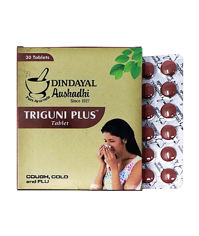 Dindayal Aushadhi Triguni Plus Tablet A proprietary ayurveda medicine.This formulation by Dindayal is trusted by many people across the country.Very effective in treating viral, fever, influenza etc. ..