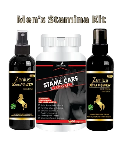 Zenius Stame Care KitZenius Stame care (60 Capsules + 30 ml Oil + 15 ml Oil) is used to help manage the testosterone levels in the body and improve sexual function in men. It may also aid in strengthe..