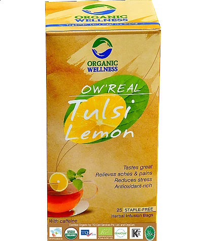 OW' Real Tulsi Lemon is a refreshing mix of Tulsi, Green Tea and Citrus Lemons.Tulsi is a great stress reliver. Rich in antioxidants it helps eliminate toxins from the body that cause free radical dam..