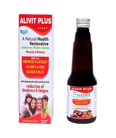 Alivit Plus SyrupAlivit Plus an Ayurveda medicine for overall general health and weakness, reduction of tiredness & fatigue and improve platelet counts and RBC. This syrup is specially formulated ..